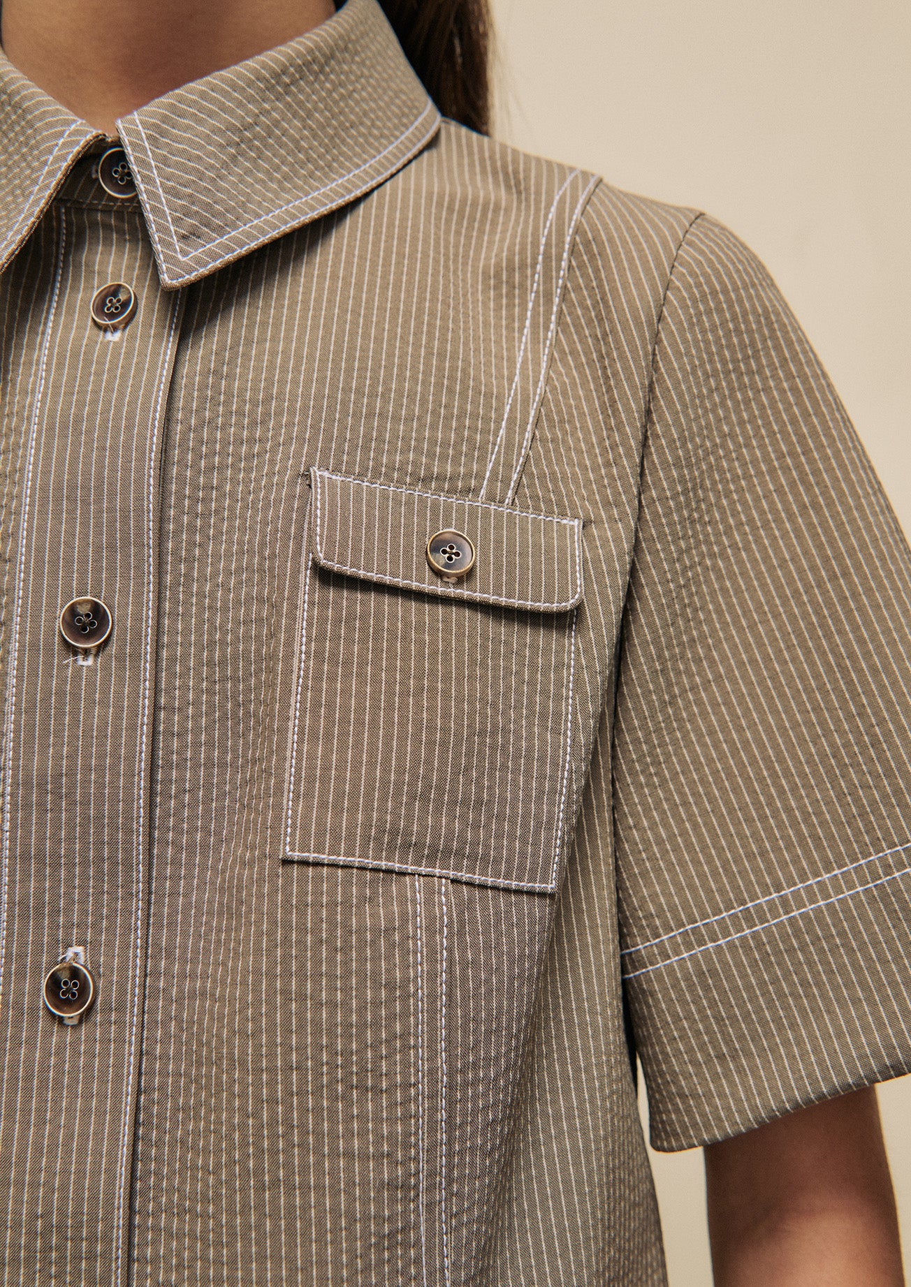 The Bea Cropped Shirt in Brown Stripe reimagines a timeless staple with a clean, modern edge. Designed for effortless, everyday dressing, it features a cropped, boxy silhouette, short sleeves, a single patch pocket, and contrast topstitching that highlights its structured lines. Finished with front button closures, this shirt combines function with minimalist style for a polished yet relaxed look.