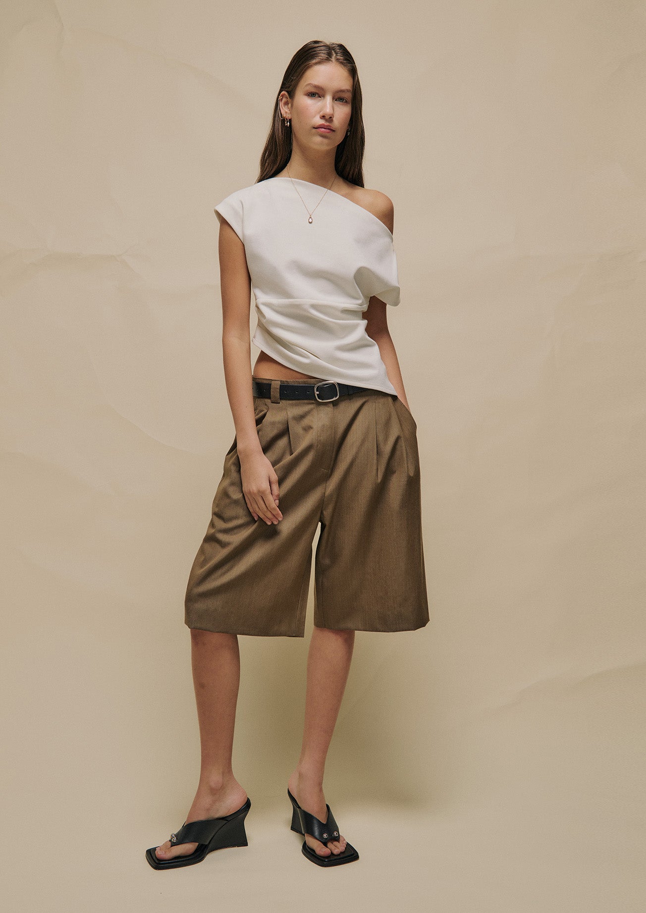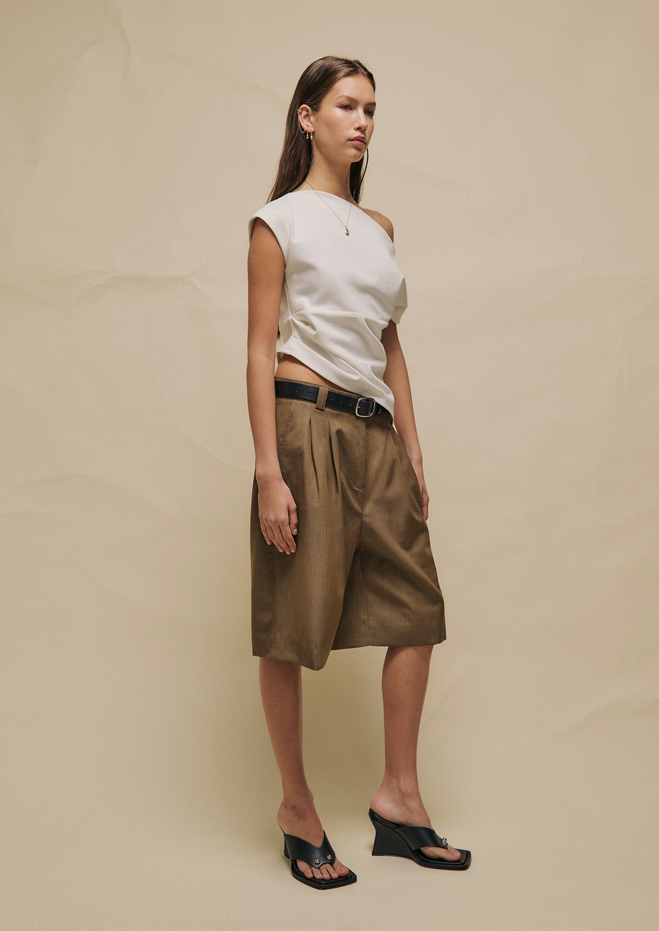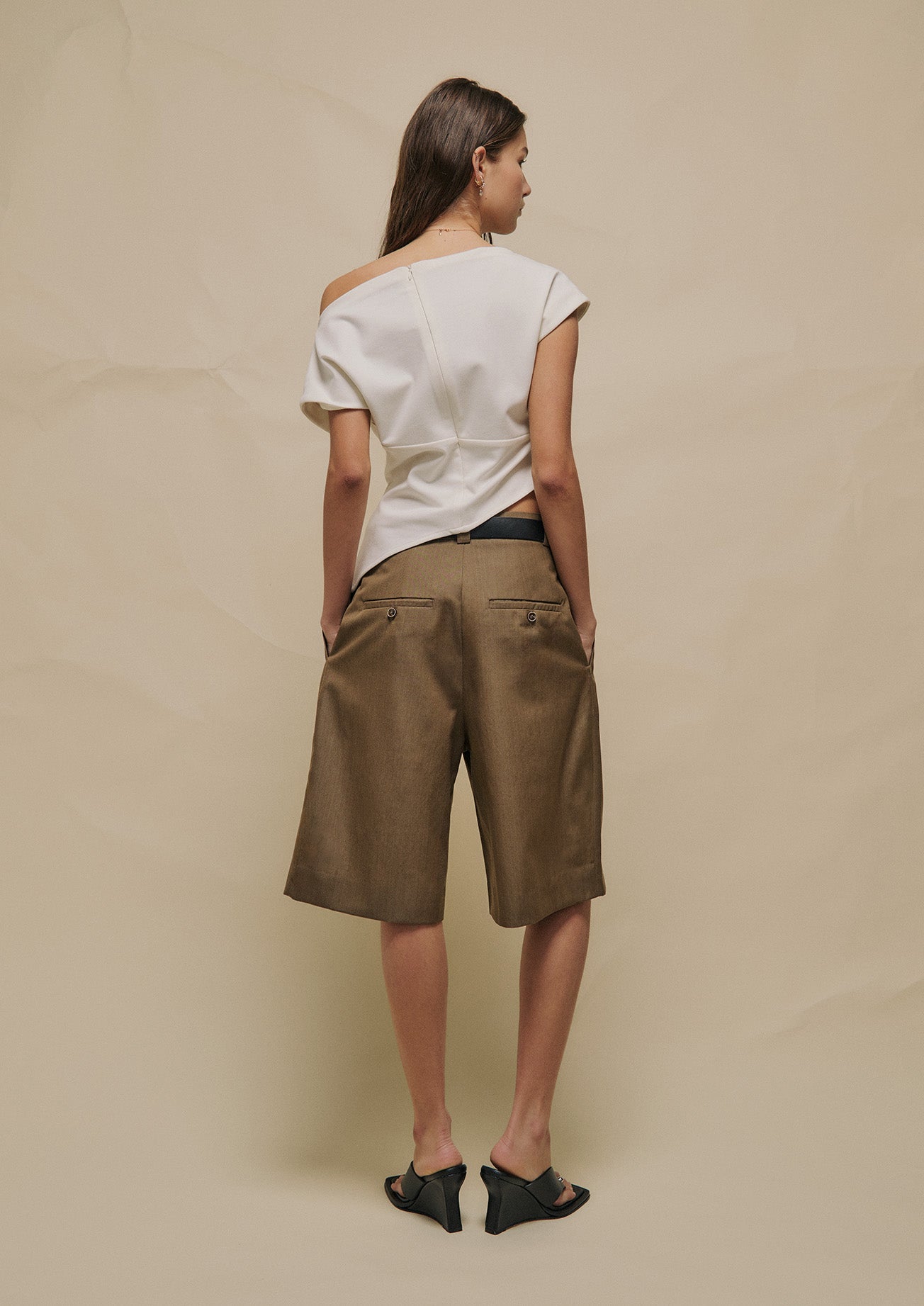 Crafted from soft Ponte fabric, the Theo Top features a boat neckline, side seam pleating, and asymmetric paneling that create a sleek, sculpted silhouette. Finished with an invisible zip closure, this top offers a polished and effortless look suitable for any occasion.